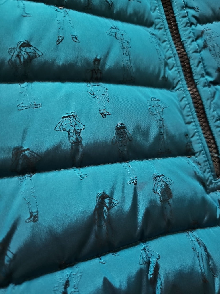 THE QUIRKY PATTERN ON THE GORGEOUS TURQUOISE OUTER SHELL IS OF A BIRDWATCHER (TWITCHER) IN VARIOUS POSES.