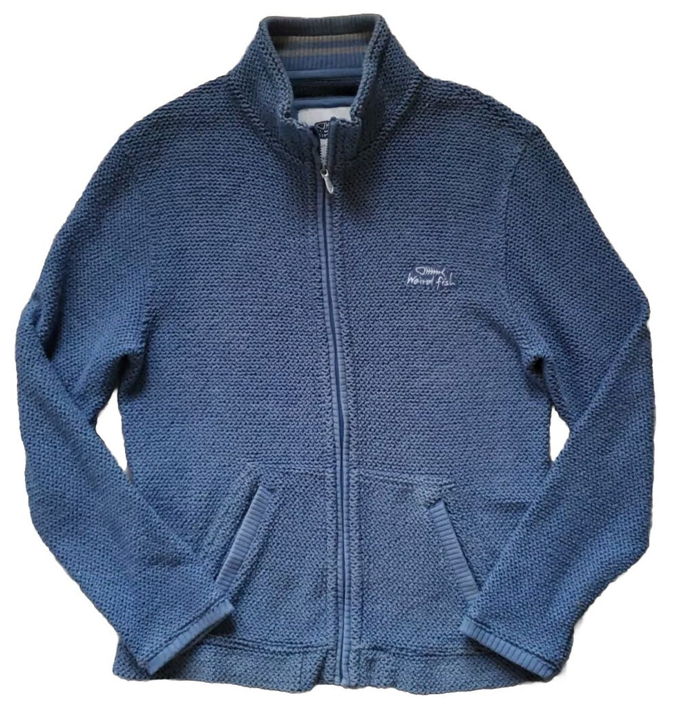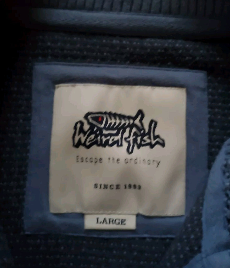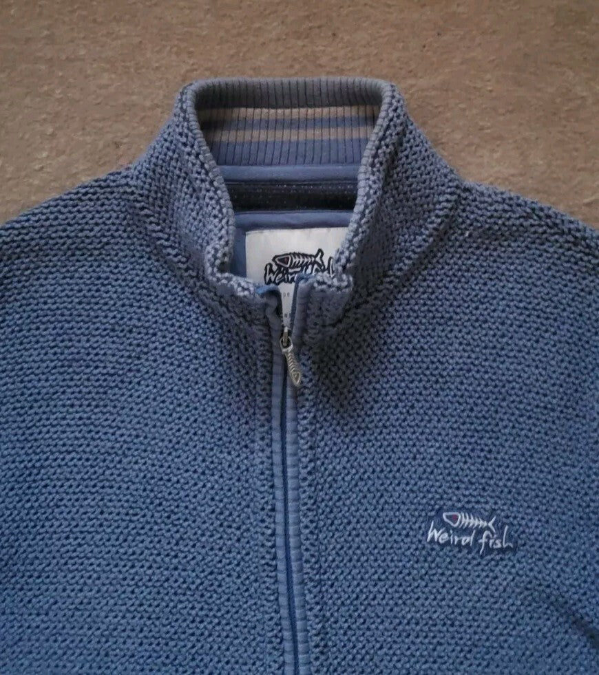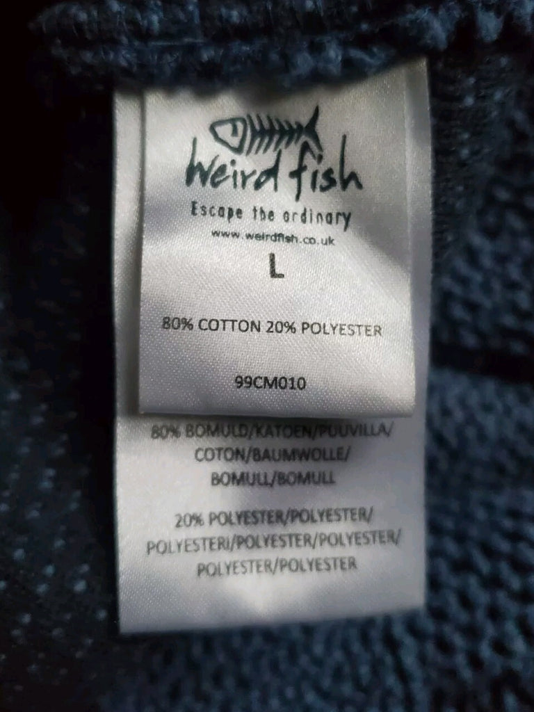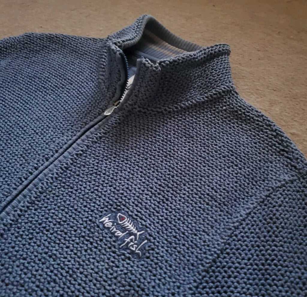 This Weird Fish fleece jacket is a men's L size in a classic blue colour with a high neck and long sleeves. The jumper features a tight-knit macaroni waffle design, made from a cotton blend material for comfort. It has a full zip closure with embroidered accents and the brand's logo, offering a stylish and practical addition to your wardrobe.