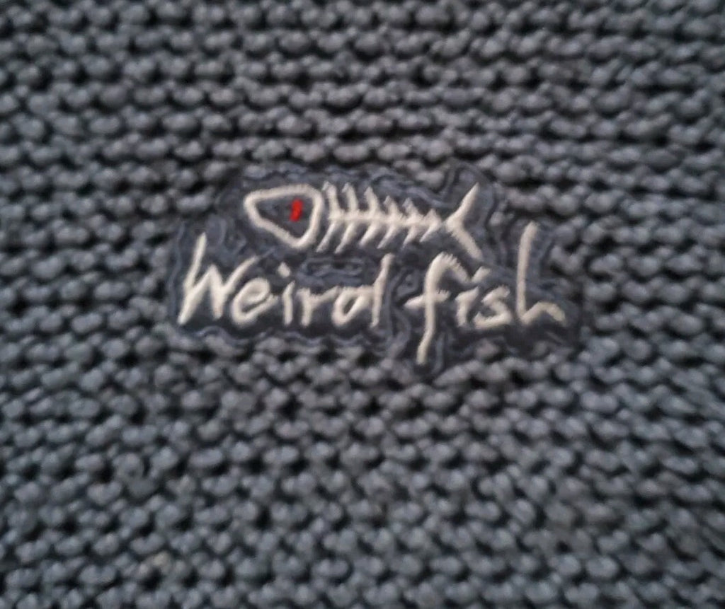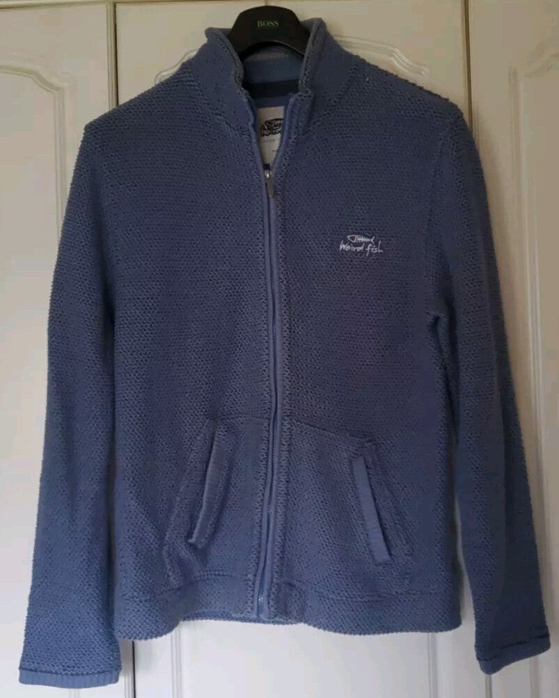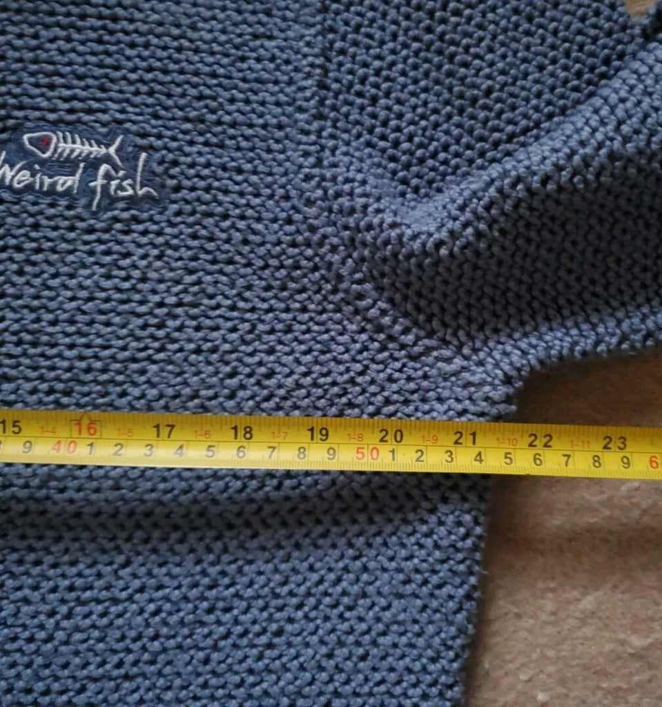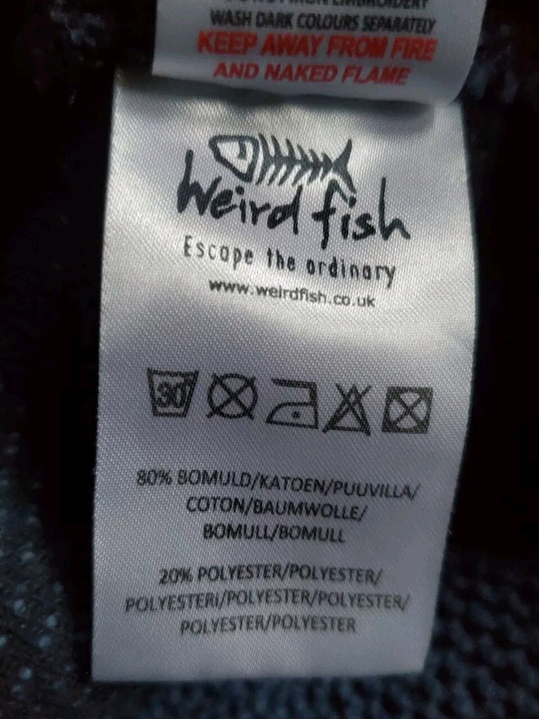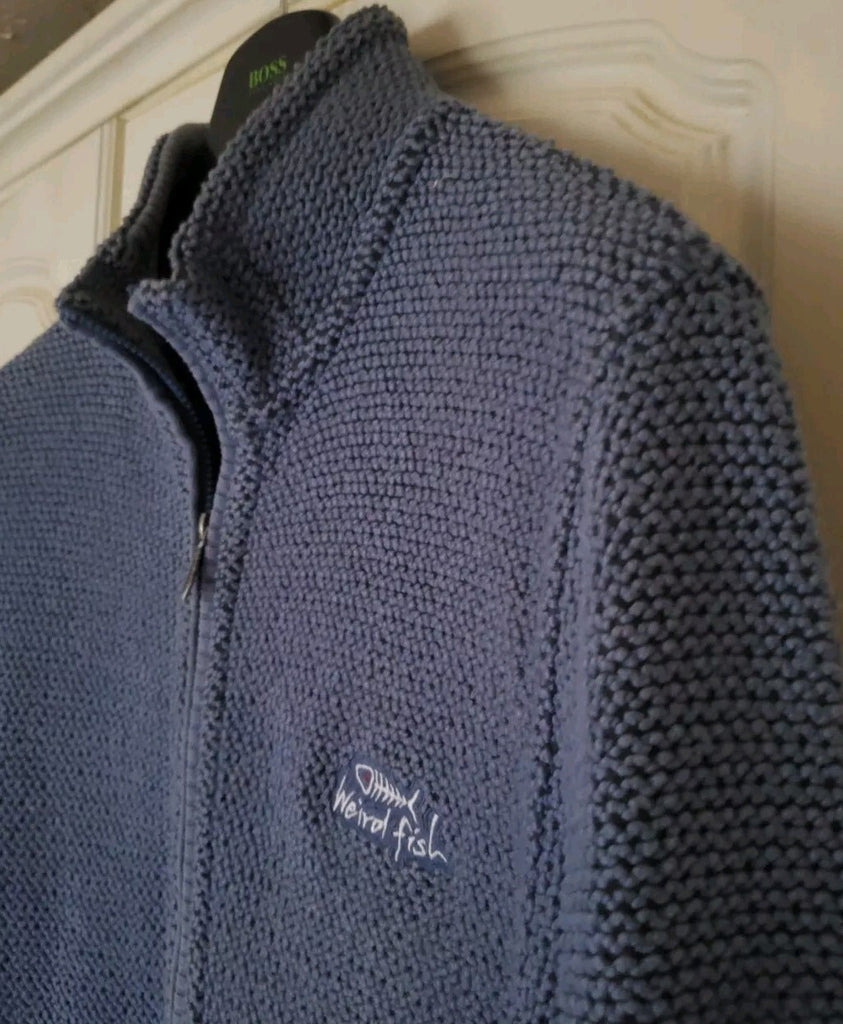 This Weird Fish fleece jacket is a men's L size in a classic blue colour with a high neck and long sleeves. The jumper features a tight-knit macaroni waffle design, made from a cotton blend material for comfort. It has a full zip closure with embroidered accents and the brand's logo, offering a stylish and practical addition to your wardrobe.