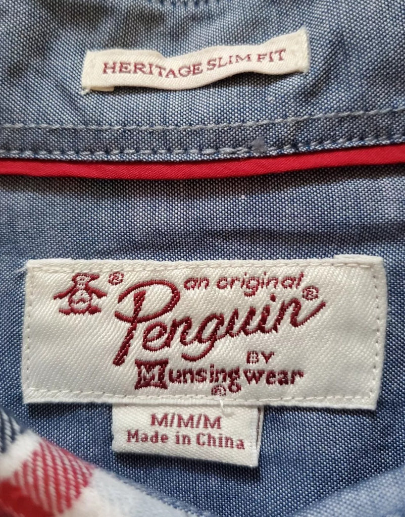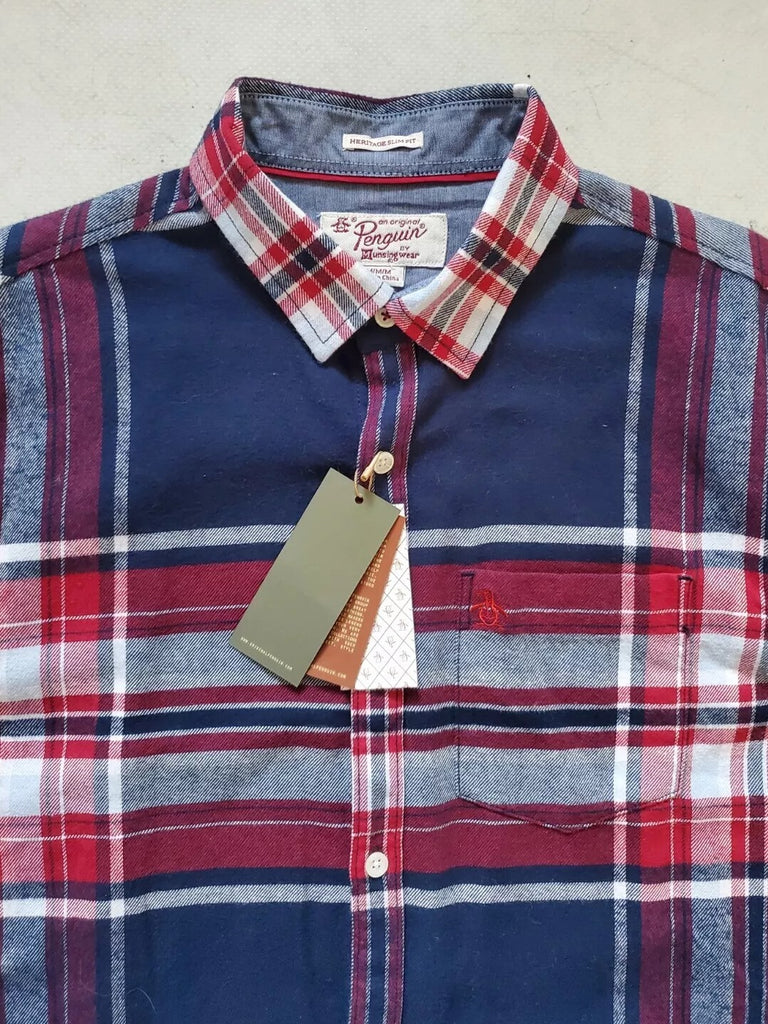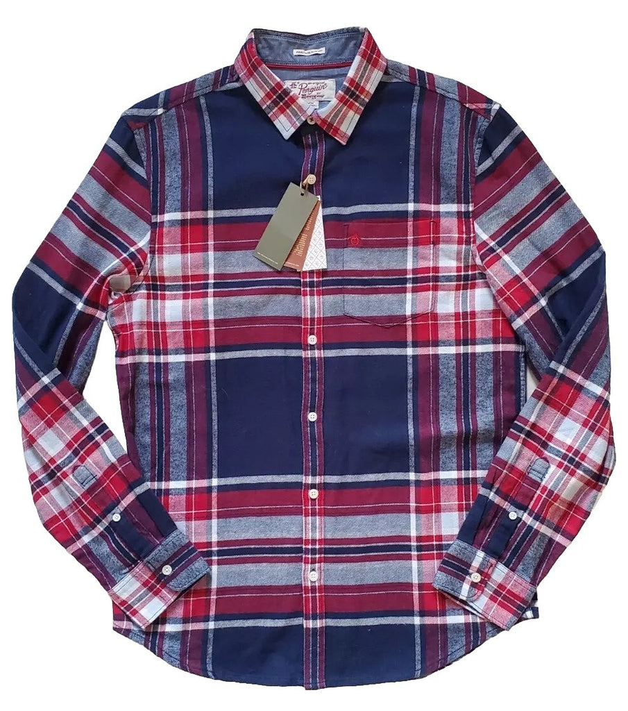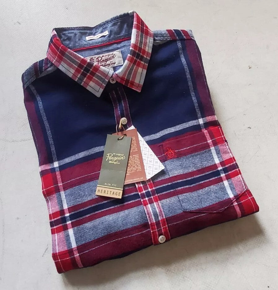 PENGUIN Shirt Mens M Heritage Slim Fit Flannel Red Blue Broad Check