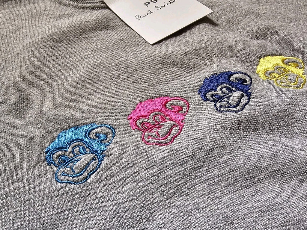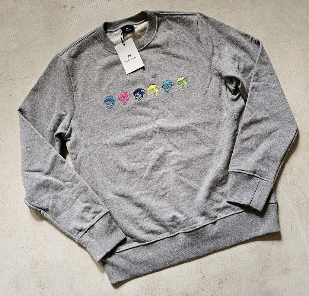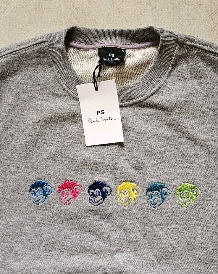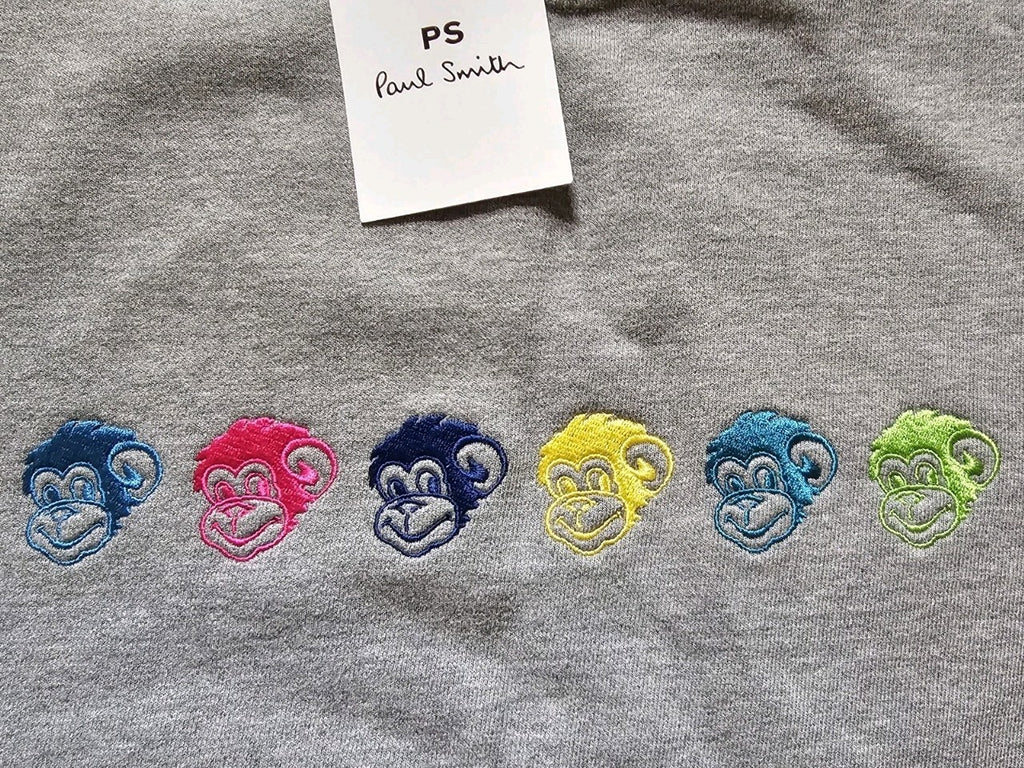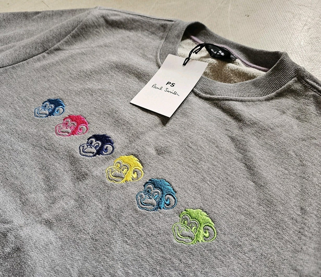 WE SELL THOUSANDS OF PS PIECES - MOSTLY LAST SEASONS THUS OUR LOWER PRICES. THEY MAY HAVE MADE A MISTAKE WHEN THEY SENT US THIS AS ITS VERY RARE WE GET A PREMIUM ITEM FROM THE CURRENT SEASONS RANGE. AS YOU'D EXPECT, PAUL SMITH HAVE ADDED A FEW UNEXPECTED DESIGNER QUIRKS! IT COMES IN MARL GREY WITH EMBROIDERED MONKEYS ON THE CHEST.
