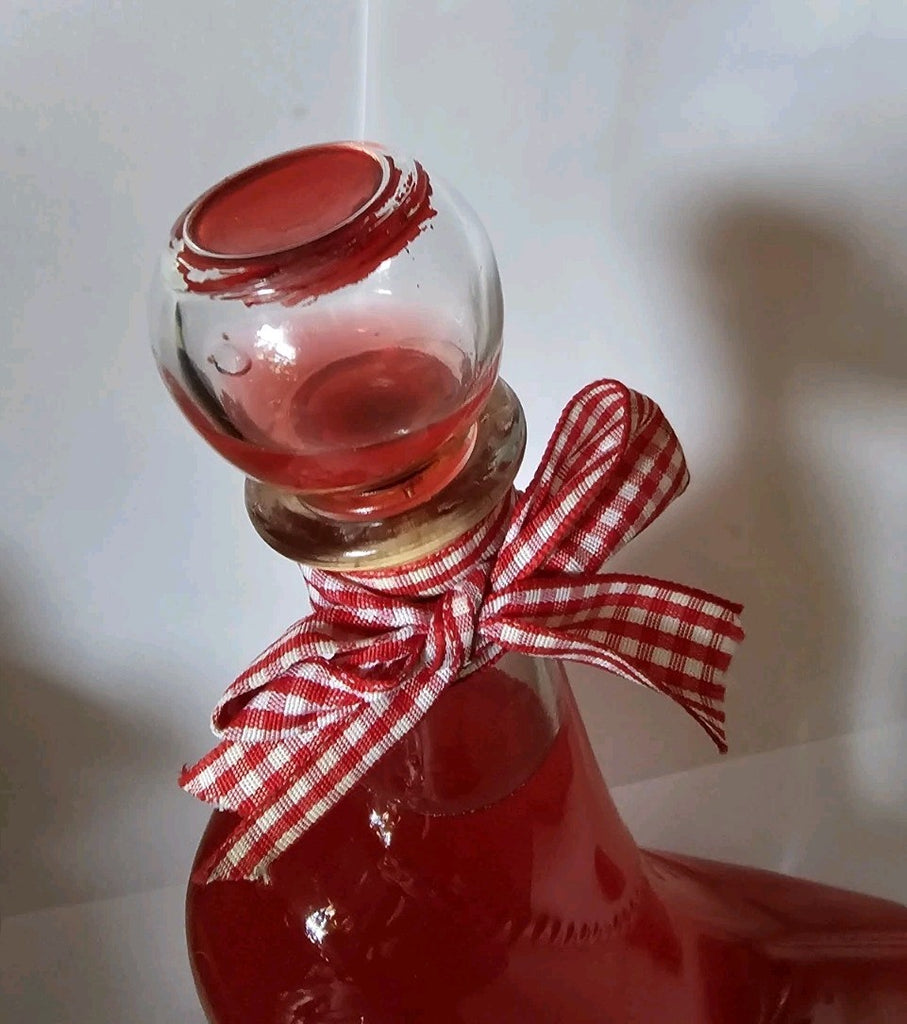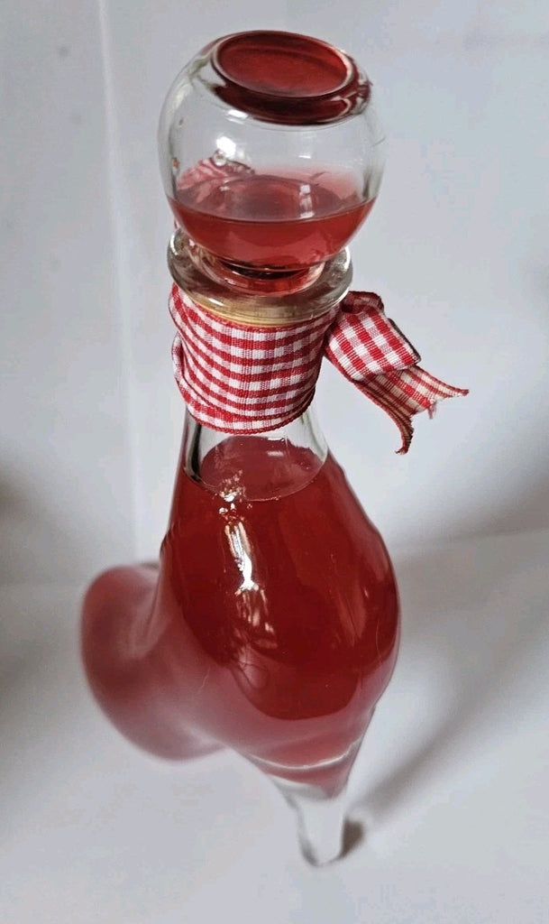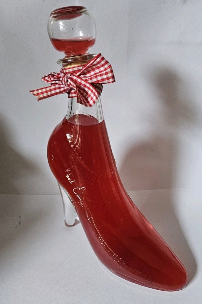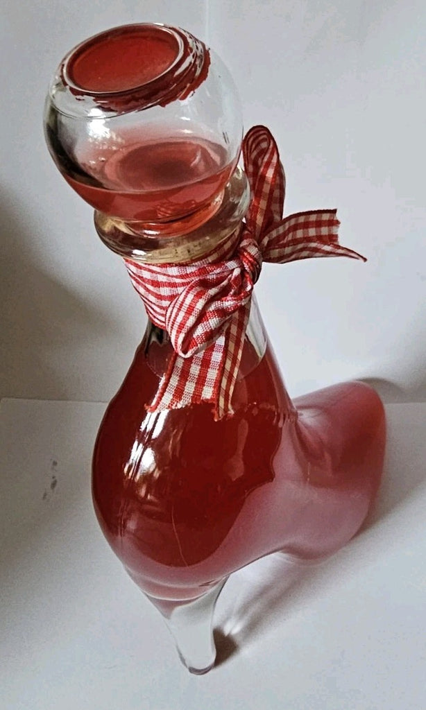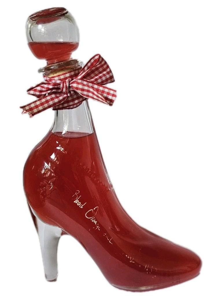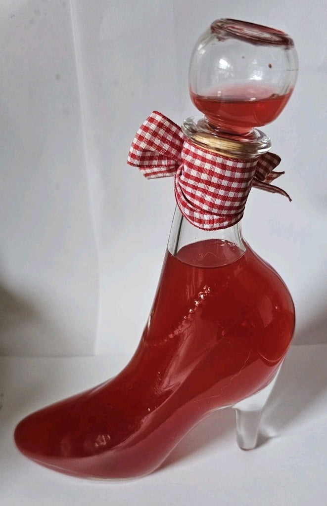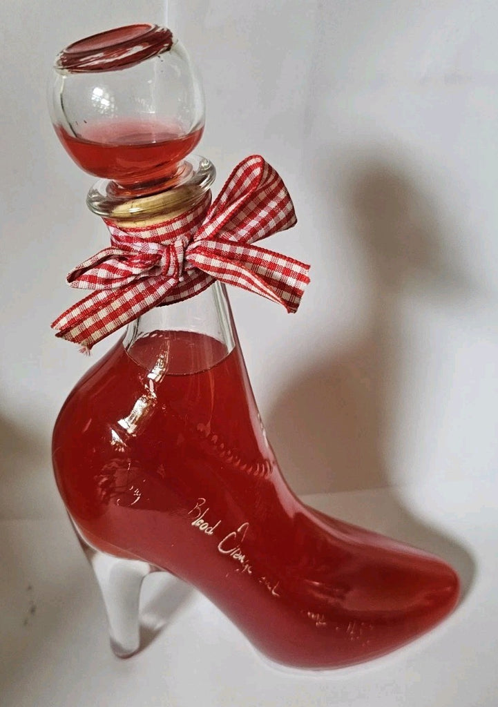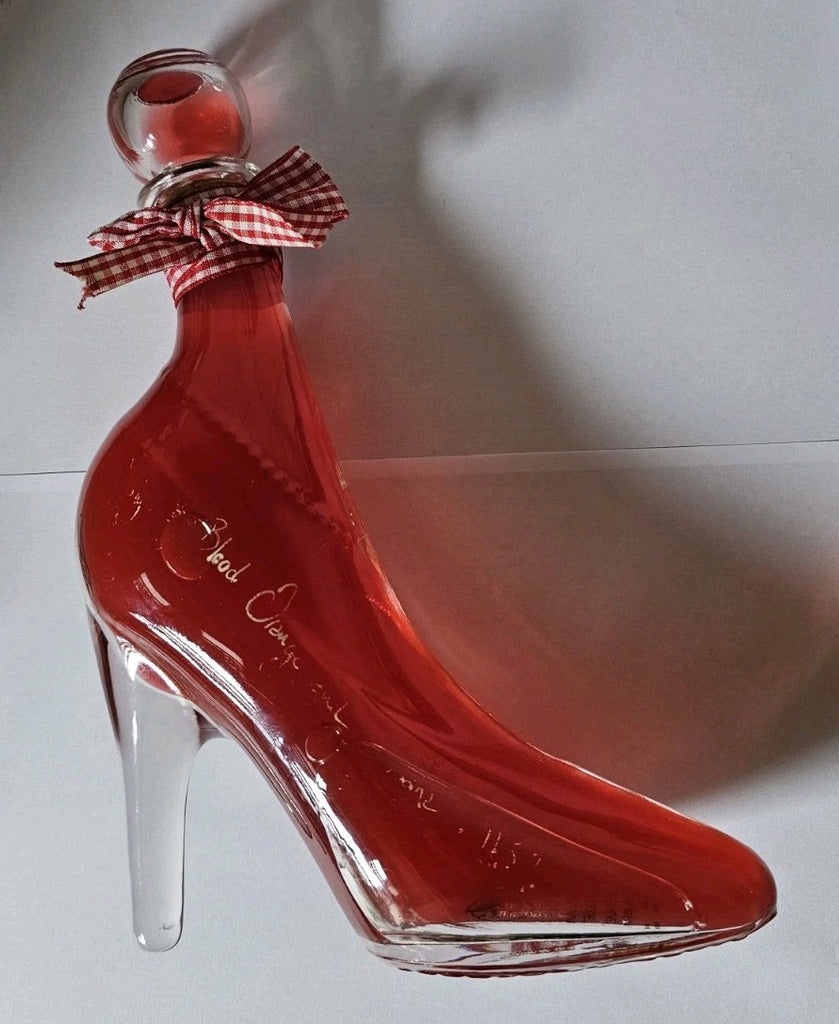 It appears they've changed the design slighly over the years - this one has a bow at the ankle. It contains a blood orange & vodka liquid but I would definitely not drink it after all these years - display purposes only!