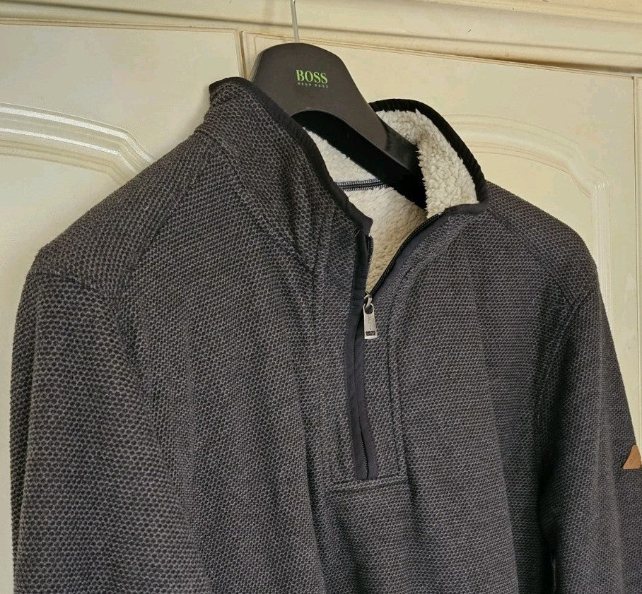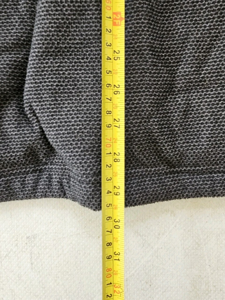 This Orvis fleece is a men's 2XL (28 inches pit to pit) in mottled grey with a high neck and long sleeves. The jumper features a tight-knit weave, made from polyester with a fleece lining for comfort and warmth. It has a quarter zip closure with the classic logo patch on the left sleeve, offering a stylish and practical addition to your wardrobe.