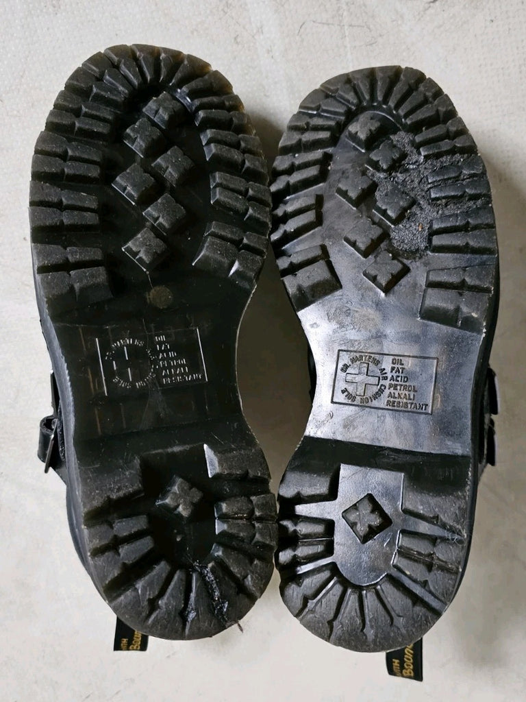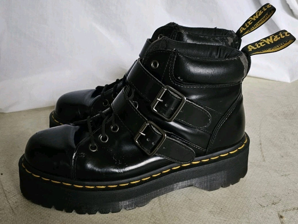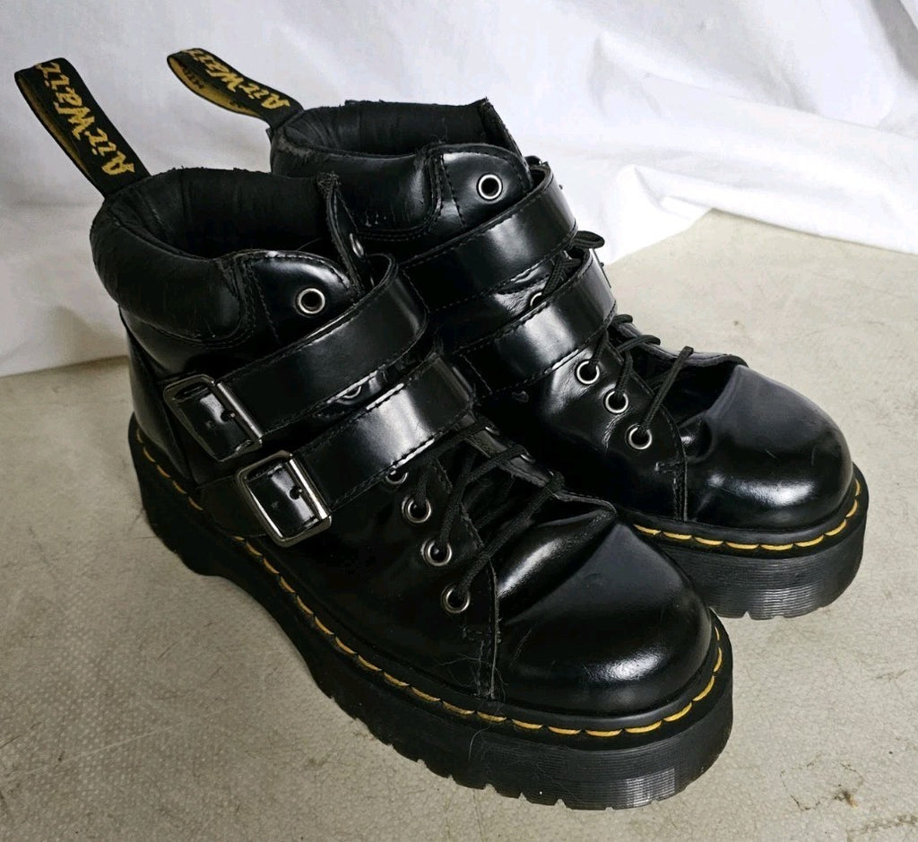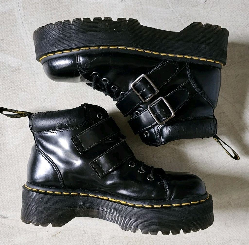 THESE BRYONY DR MARTENS BOOTS ARE RARELY FOUND UP FOR SALE ON EBAY. THE ADDITION OF THE DOUBLE BUCKLES AND THICKER SOLES TO THE CLASSIC 8 EYE MODEL CREATES AN EYE CATCHING TWIST.
