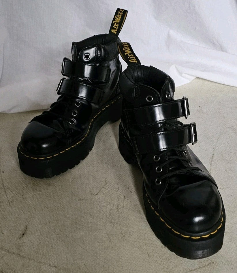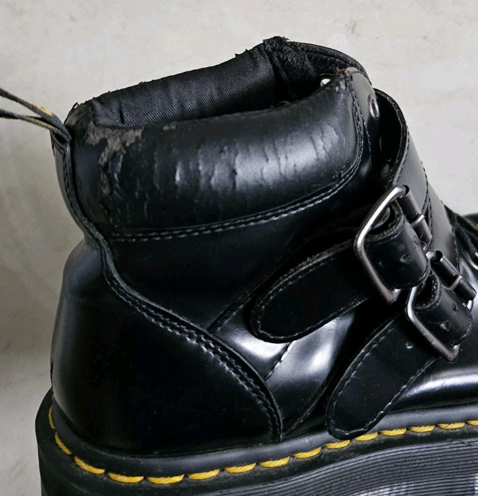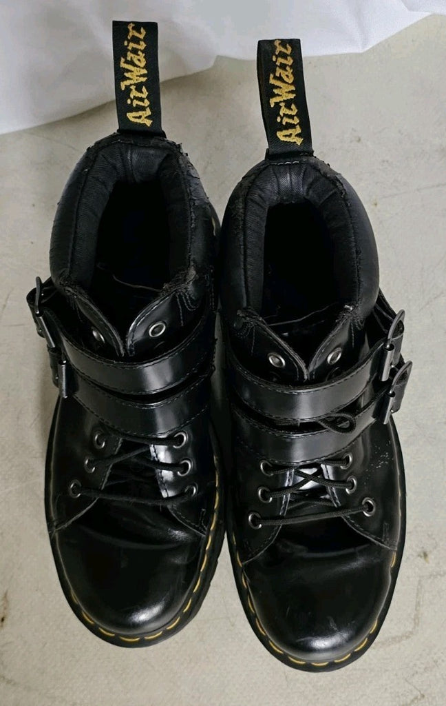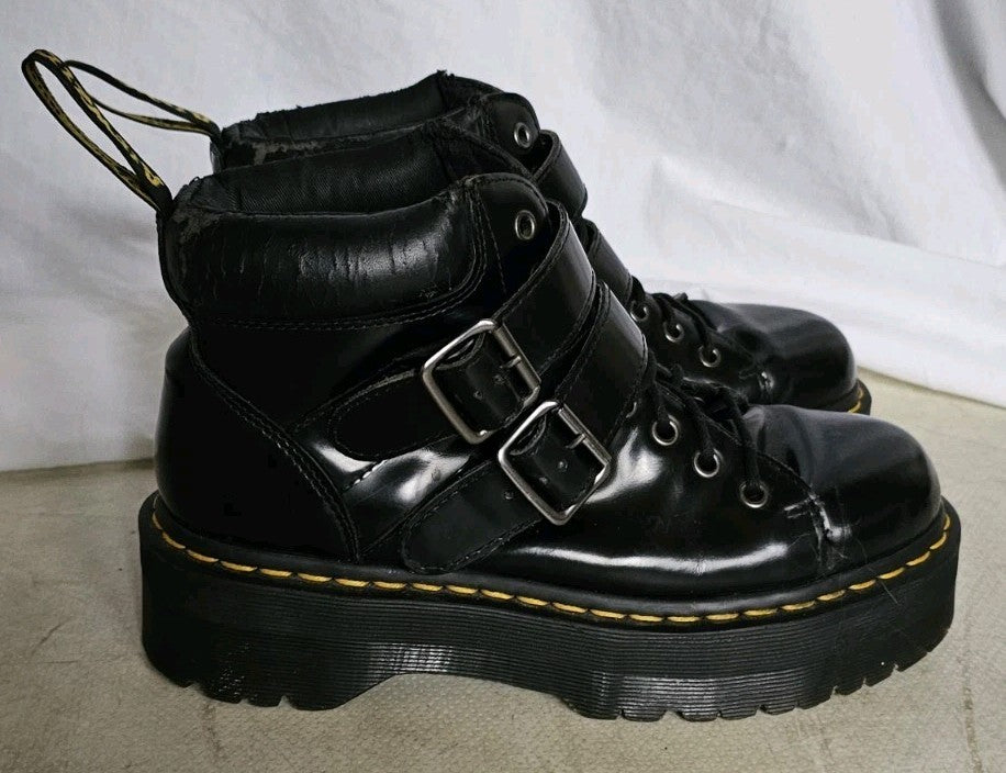 THESE BRYONY DR MARTENS BOOTS ARE RARELY FOUND UP FOR SALE ON EBAY. THE ADDITION OF THE DOUBLE BUCKLES AND THICKER SOLES TO THE CLASSIC 8 EYE MODEL CREATES AN EYE CATCHING TWIST.
