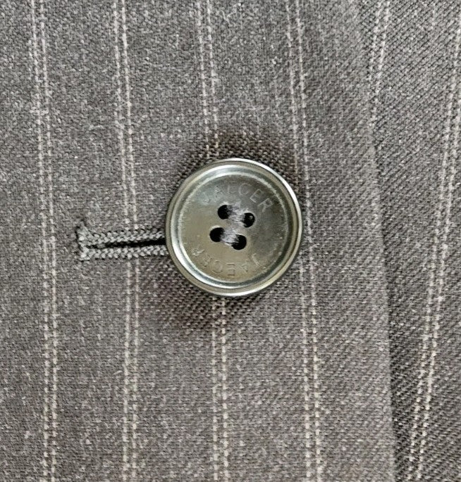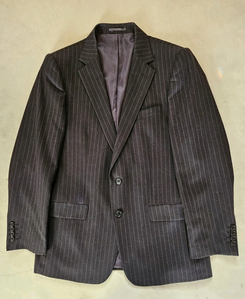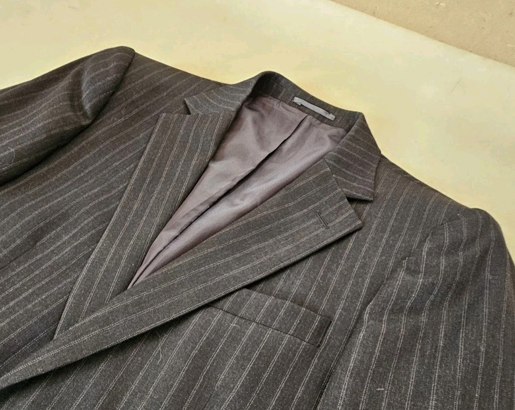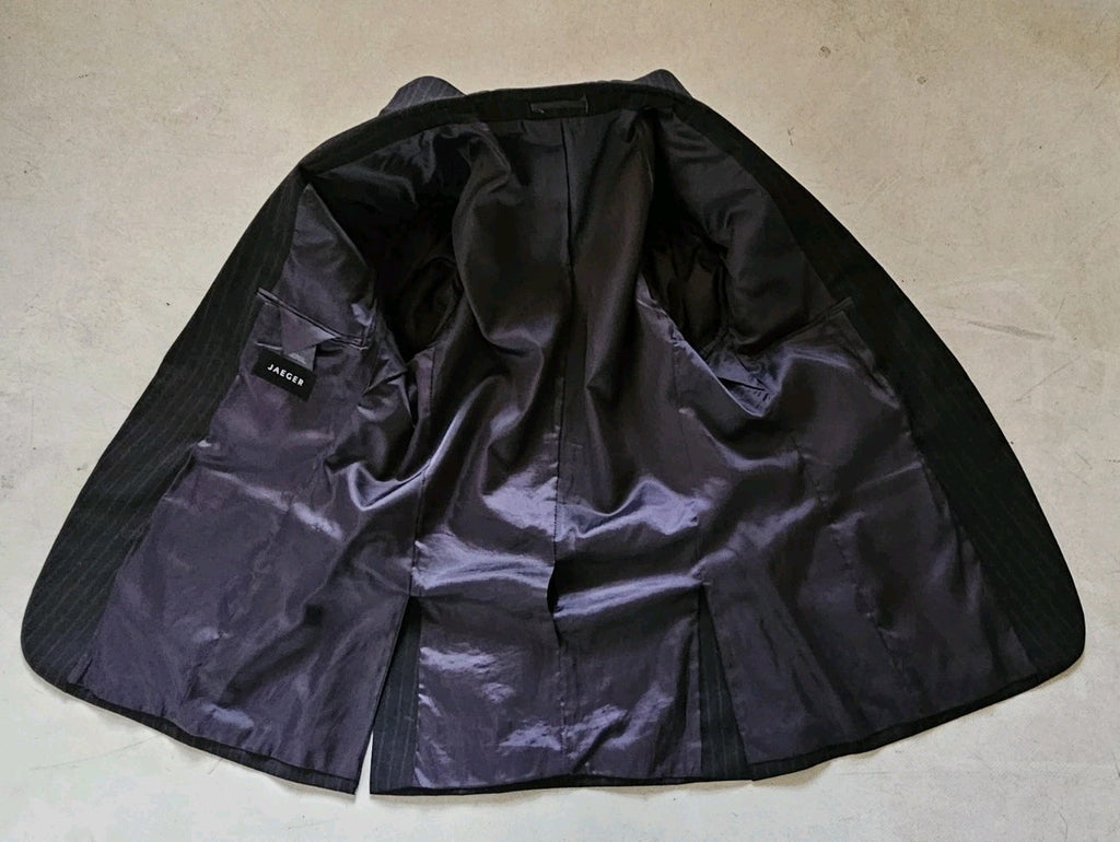 GREAT OPPORTUNITY TO OWN AN AUTHENTIC JAEGER SUIT IN BRAND NEW CONDITION. THIS SUIT COMES IN ANTHRACITE GREY PINSTRIPED WOOL.