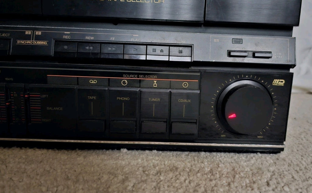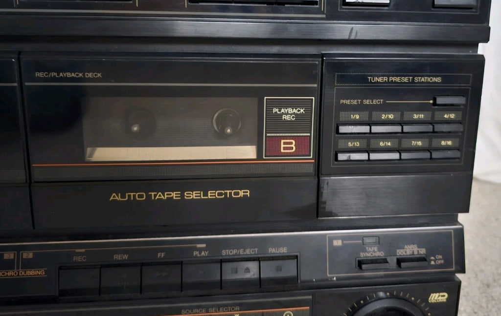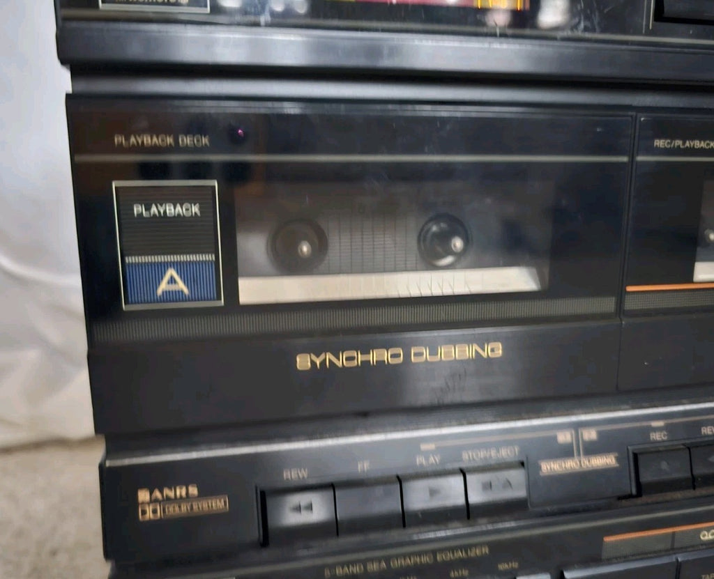 The machine switches on fine. All lights come on. Radio works. Counter works. Rewind and FF work fine, left hand tape seems to be working fine....BUT issue with the right hand tape - I tested it with a cassette and only one spool is turning so the tape sort of bunches up. Most likely a deteriorated belt but might be something else. I was going to open it up and have a look but suddenly remembered I'm not an engineer and would probably do more damage than good if I went poking around inside without a clue what I'm even supposed to be looking for!