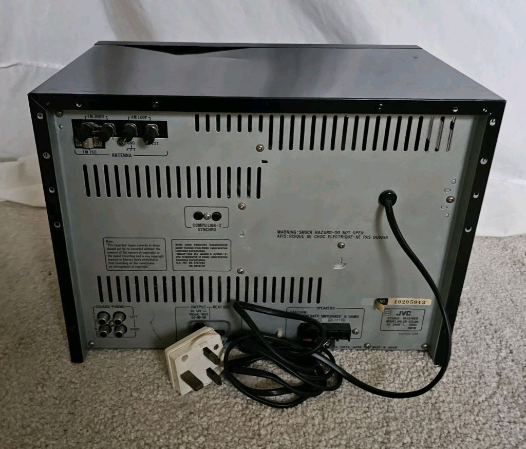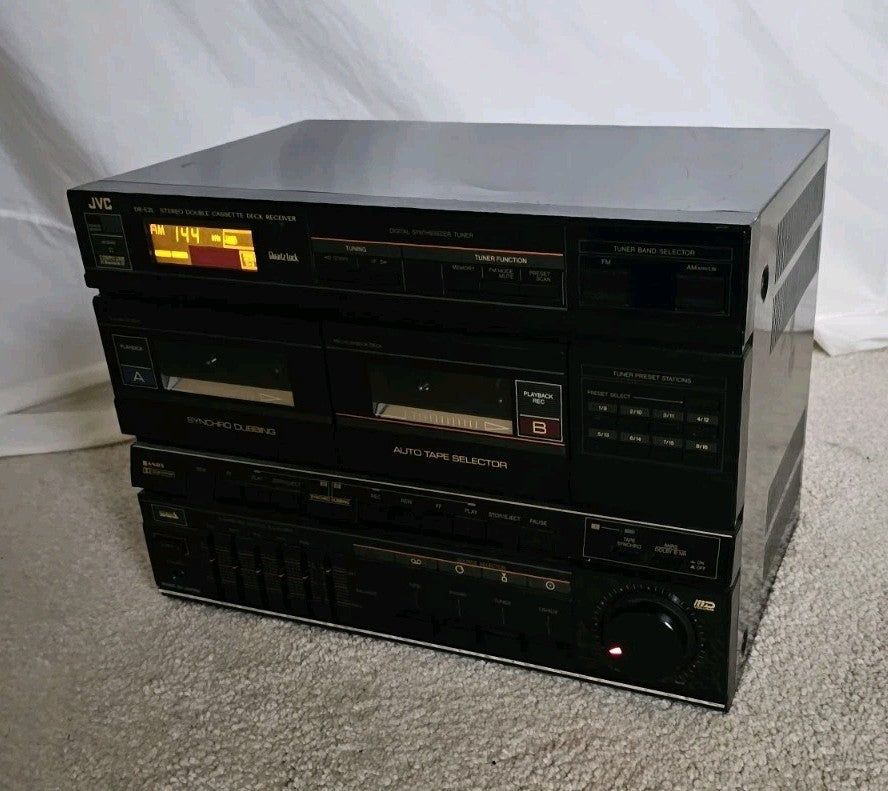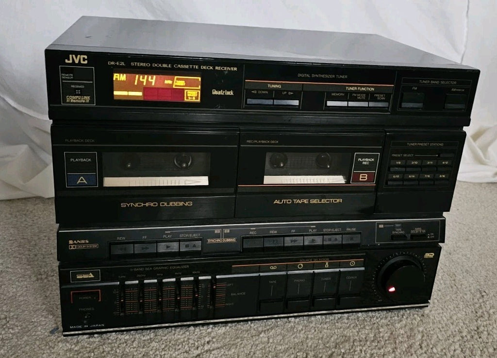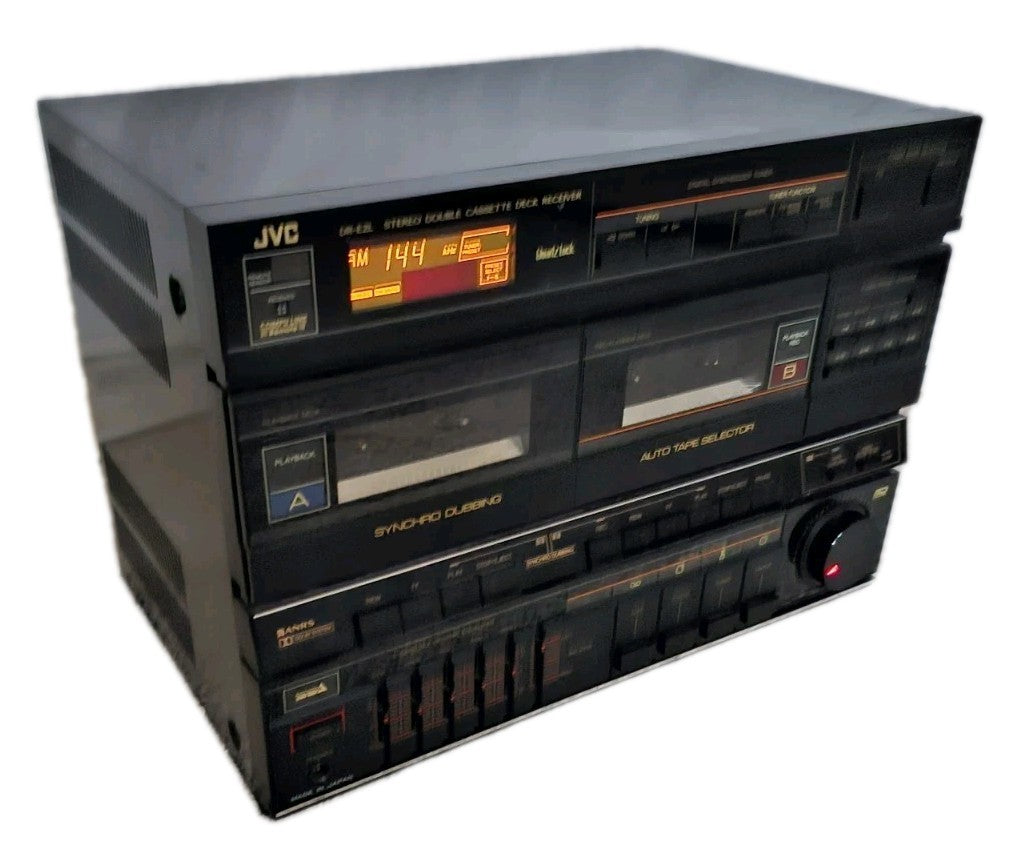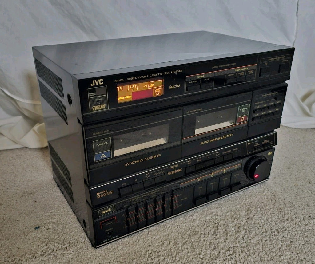 The JVC DR-E2L is a vintage 1980's Hi-Fi stereo double cassette deck receiver (part of a component system) featuring AM/FM radio with 8 presets, an amplifier, and headphone jack. Designed for tapes, it typically paired with the AL-E1 turntable.