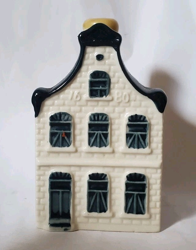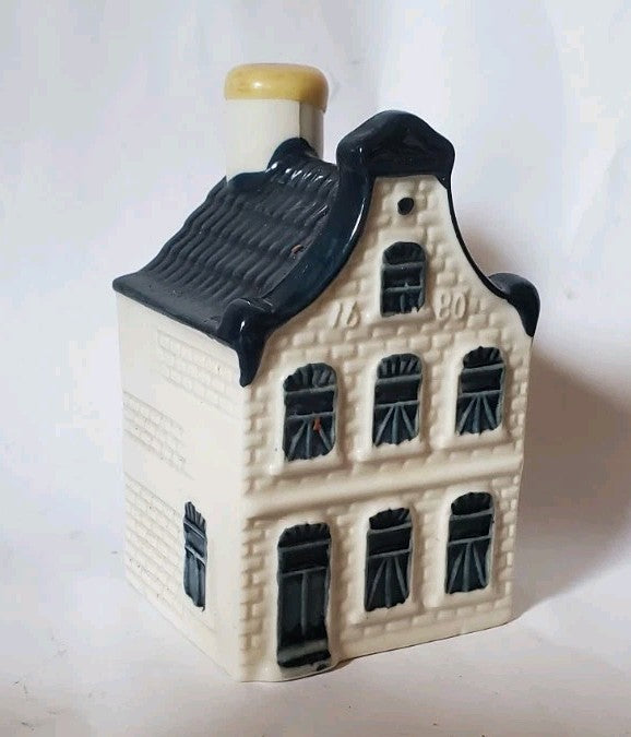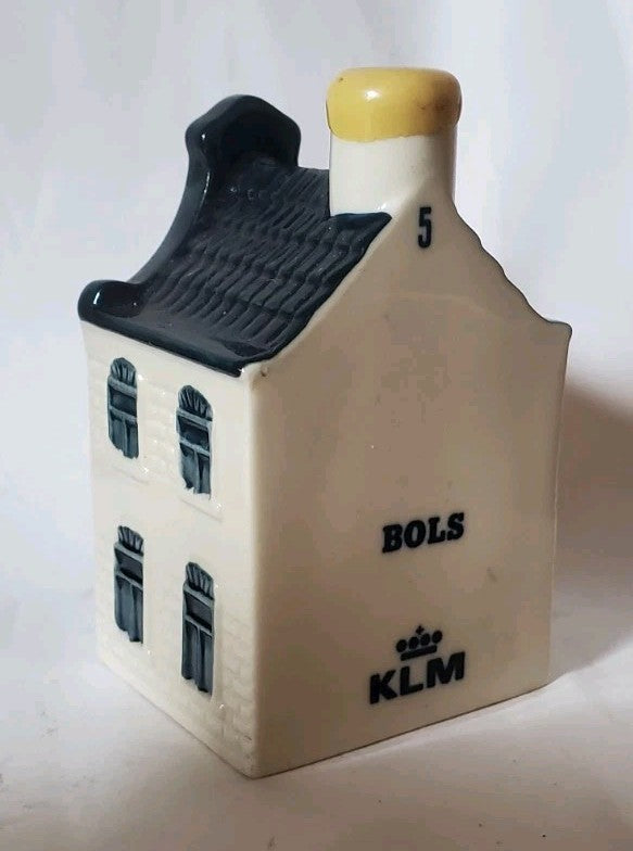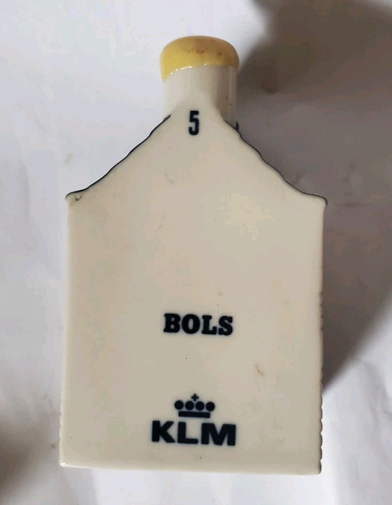KLM started issuing these miniature bottles in 1952. Air companies were not allowed to give presents to their customers because of unfair competition. So, KLM had some Blue Delft houses made, and filled them with genever. Then, of course, their competitors complained "KLM is giving presents to their customers". The KLM said "May we decide how we serve our drinks? Is there a law which tells me drinks have to be served in a glass?"... and so it all started.