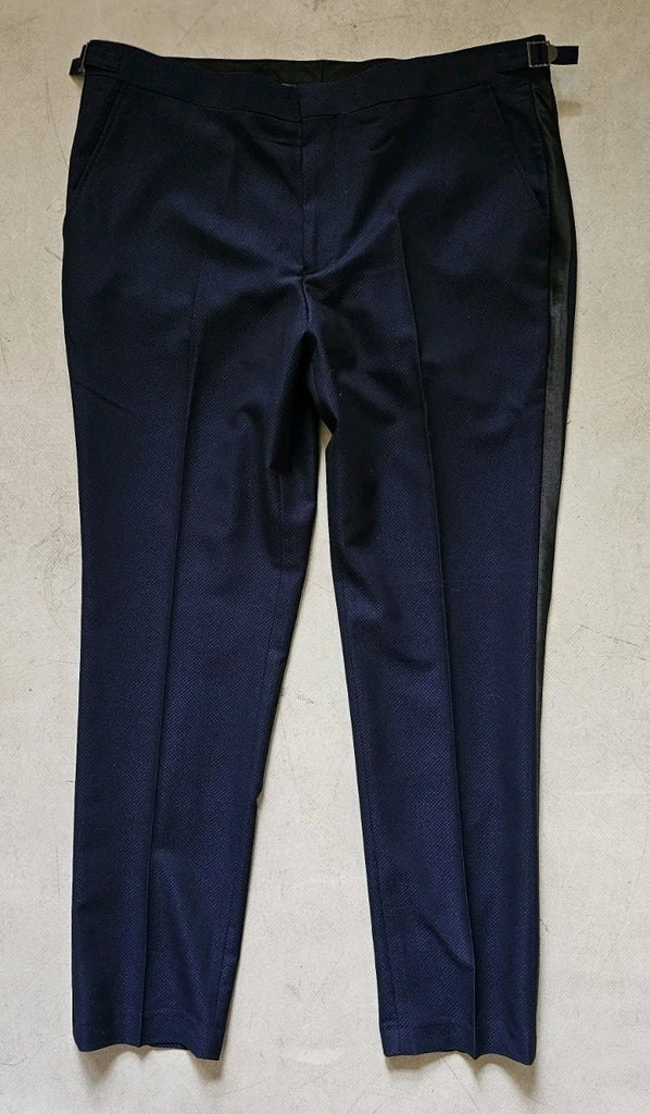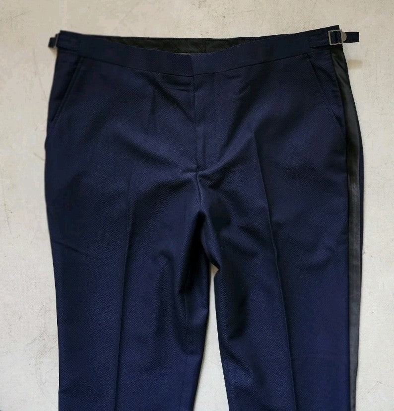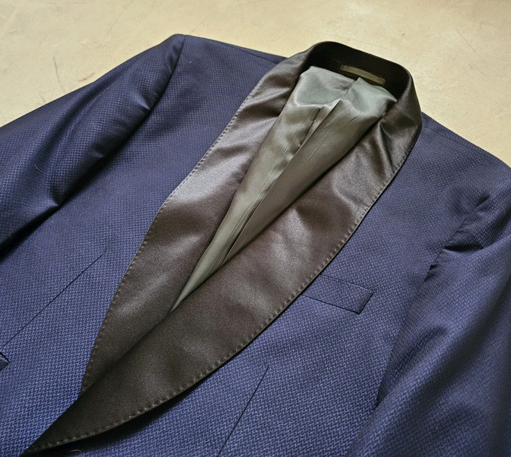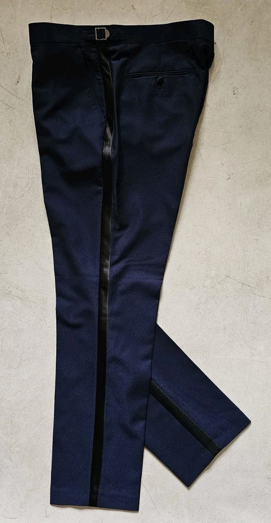 MONCRIEF HAVE BETTER PHOTOGRAPHERS THAN MYSELF SO THE FIRST PIC IS A STOCK IMAGE, THE REST ARE OF THE ACTUAL SUIT THAT YOU'LL RECEIVE. AS YOU CAN SEE THE SUIT COMES IN A GORGEOUS, MOTTLED MIDNIGHT BLUE WITH BLACK SATIN TRIM - MANY TUXEDOS LOOK FANTASTIC BUT THIS MODEL, THE CLIFTON. IS SOMETHING REALLY SPECIAL - A REAL STANDOUT PIECE!