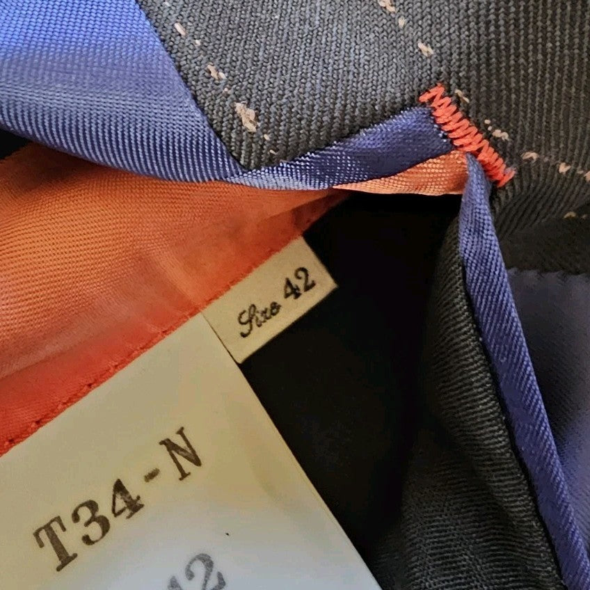 THE SUIT LABEL STATES IT'S A 42R/34 BUT AS YOU PROBABLY KNOW THE SIZING VARIES MASSIVELY DEPENDING ON THE CUT AND STYLE SO I ALWAYS MEASURE SUITS UP MYSELF TO GIVE OUR CLIENTS EXACT AND TRUE SIZING. PLEASE COMPARE THE MEASUREMENTS BELOW WITH YOUR OWN SUIT TO ENSURE A GOOD FIT. WE ACCEPT ALL RETURNS BUT IT'S A LOT EASIER TO GET IT RIGHT FIRST TIME!