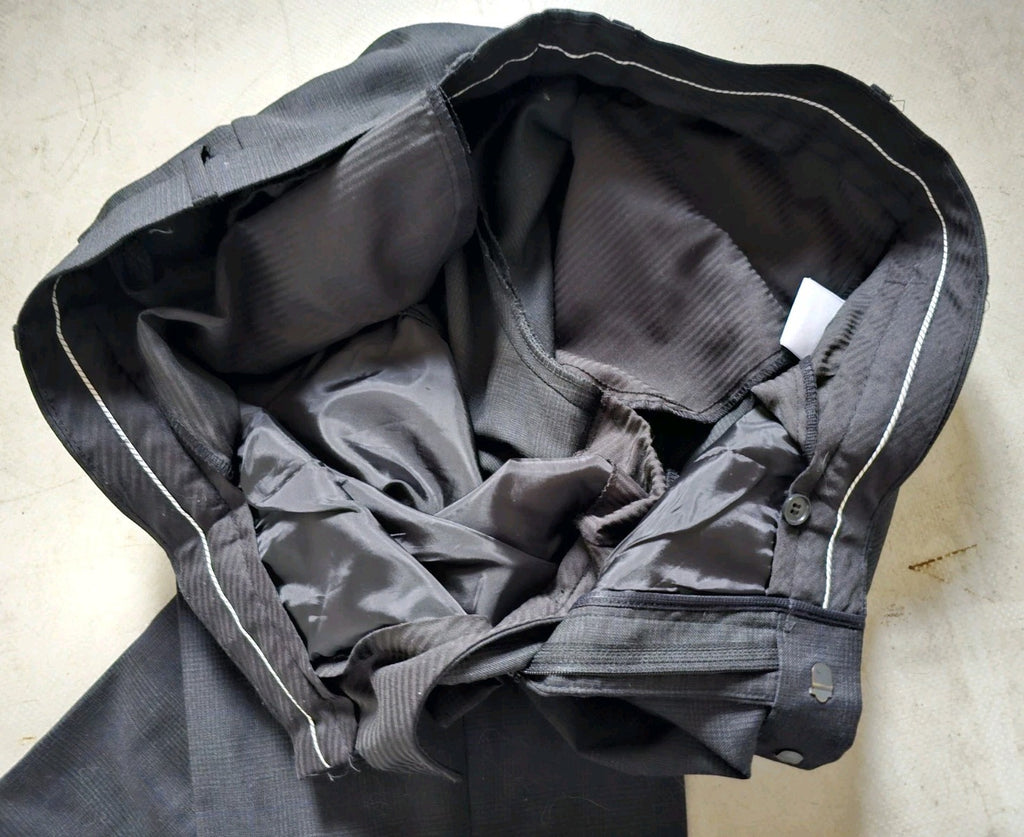PLEASE BE AWARE, THIS PARTICULAR SUIT HAS BEEN PROFESSIONALLY TAILORED TO FIT ITS PREVIOUS KEEPER. THE SLEEVES ARE SHORTER THAN USUAL AND THE INSIDE LEG IS 26 INCHES. SO A SUIT FOR A GENTLEMAN OF SMALLER STATURE.