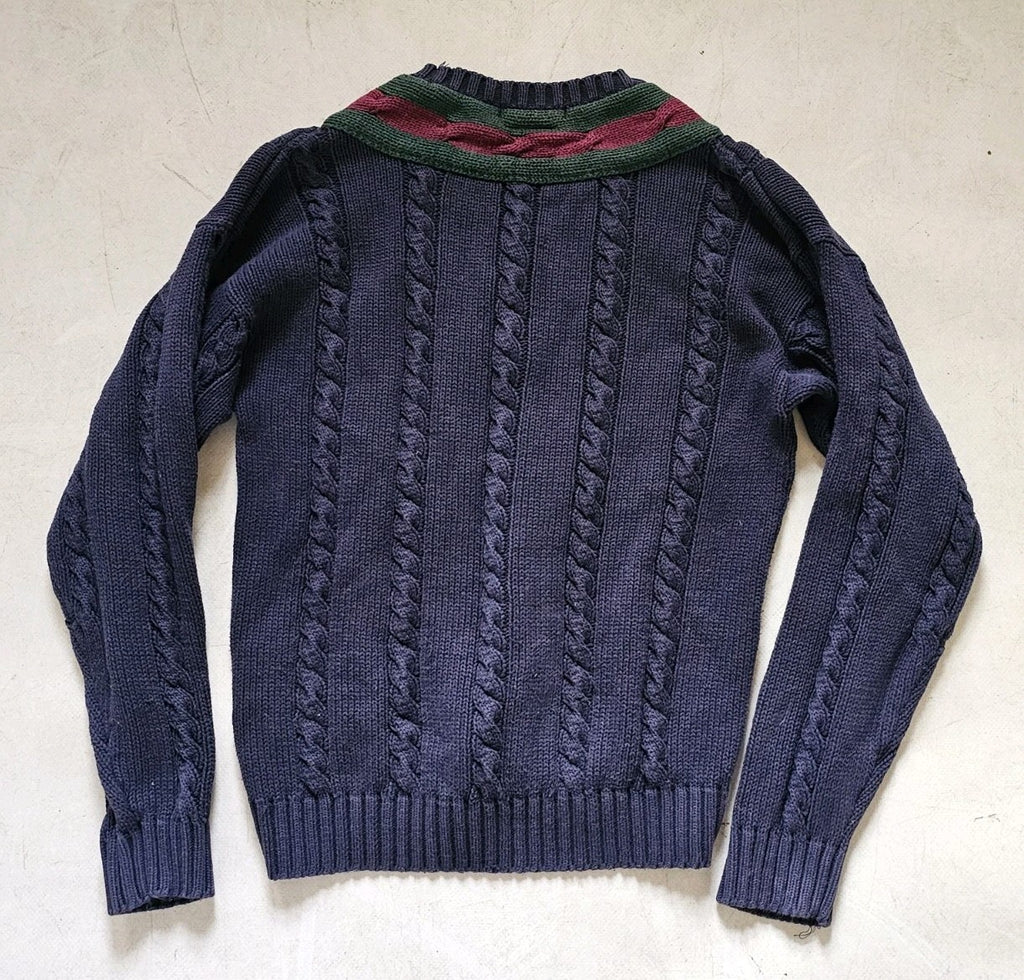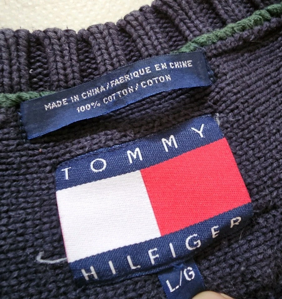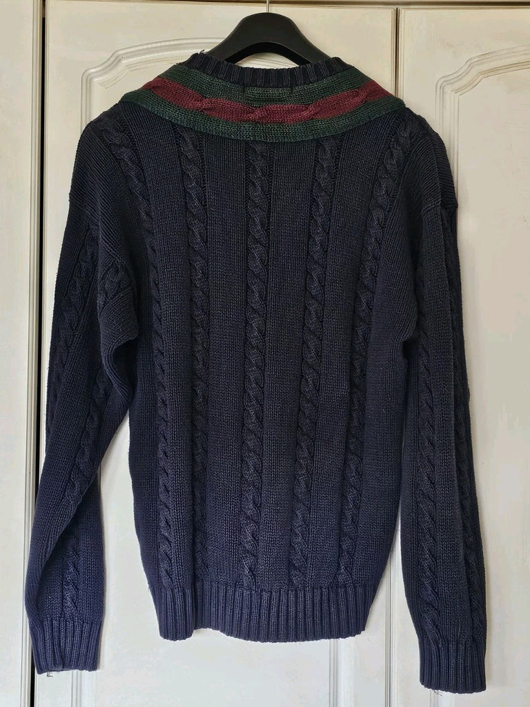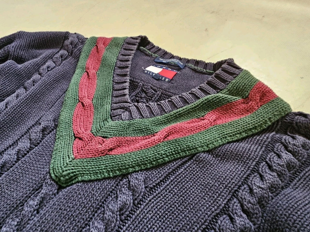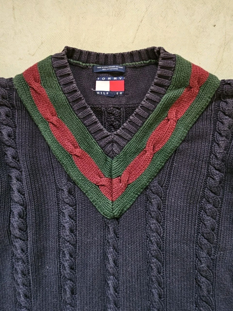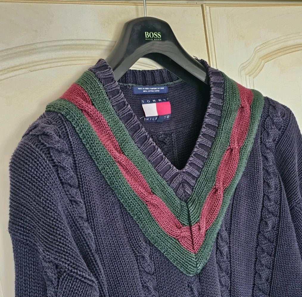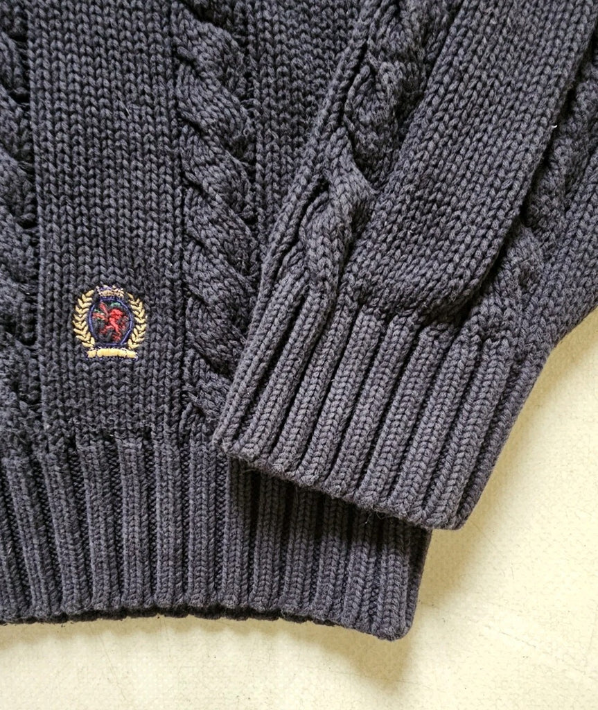 TOMMY HILFIGER Cricket Jumper Mens L Chunky Cable Knit Navy Blue Vintage 1990s