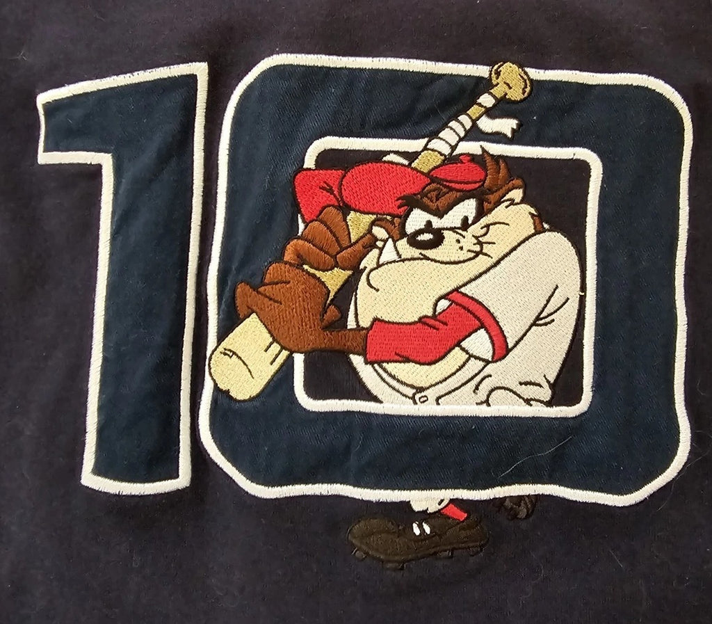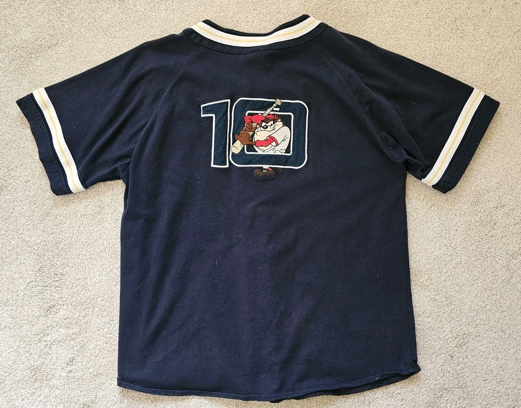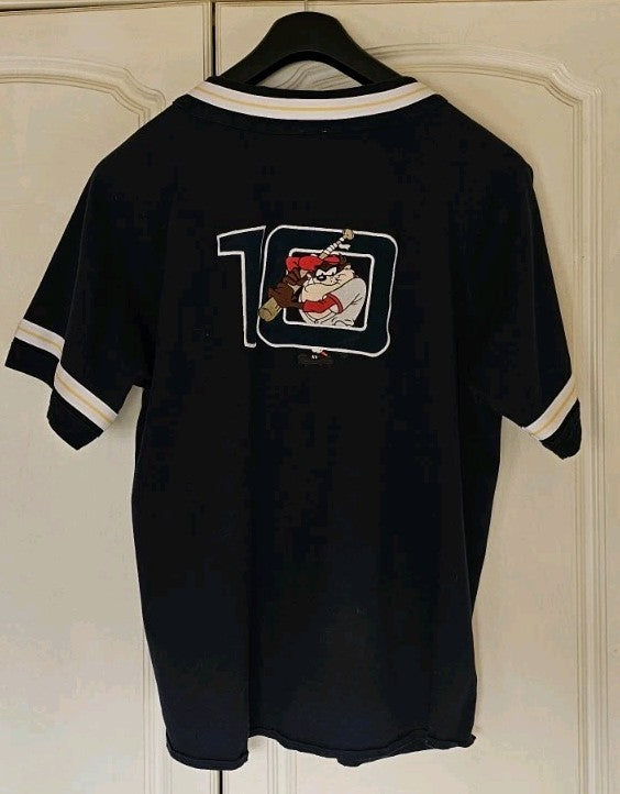 Very rare opportunity to own a genuine piece of Warner Bros history. This is a 1999 Looney Tunes Tasmanian Devil Baseball Jersey (he's embroidered on the back with a baseball bat!). These were only available at the Warner studio shop so there aren't many around. I doubt you'll ever find this model in such good condition elsewhere